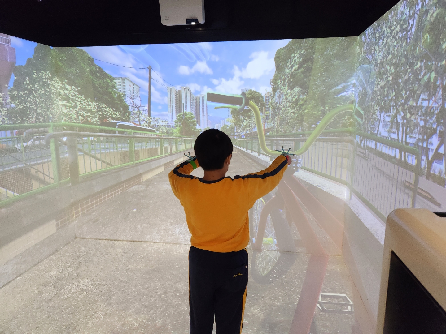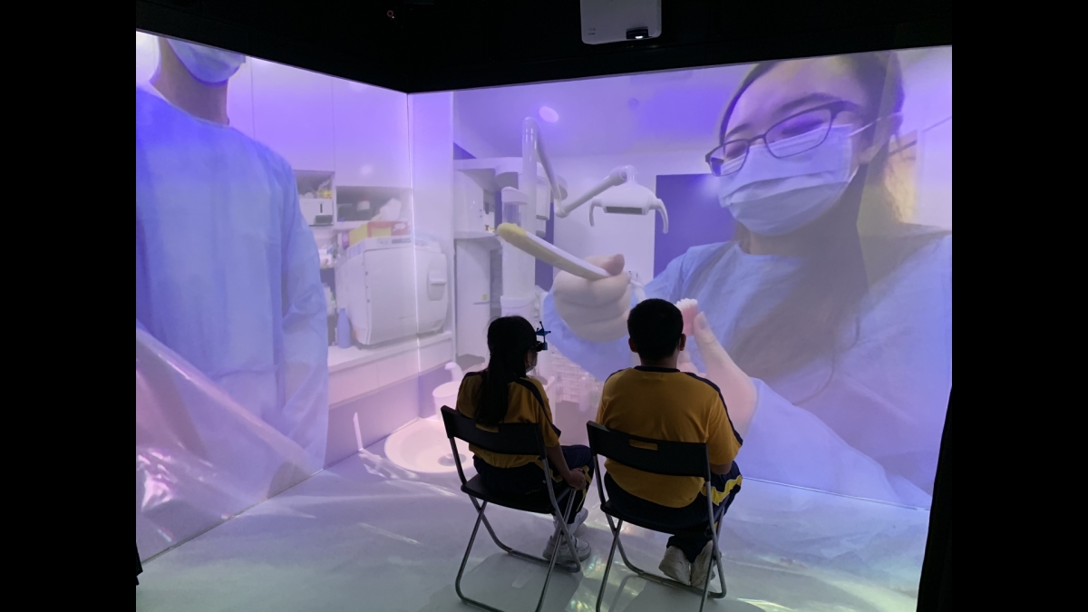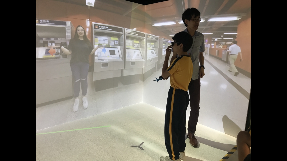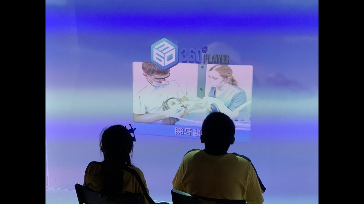 沉浸式虛擬實境系統所運用的三維空間投影技術,不但能讓學生眩暈不適感大大減少,更能提供使用者視覺及聽覺的類比,D讓學生在擬真的環境進行學習。此外,新系統亦能解決以往VR眼鏡笨重、互動性低的缺點,貼合智障學童的需要。 - 影系統