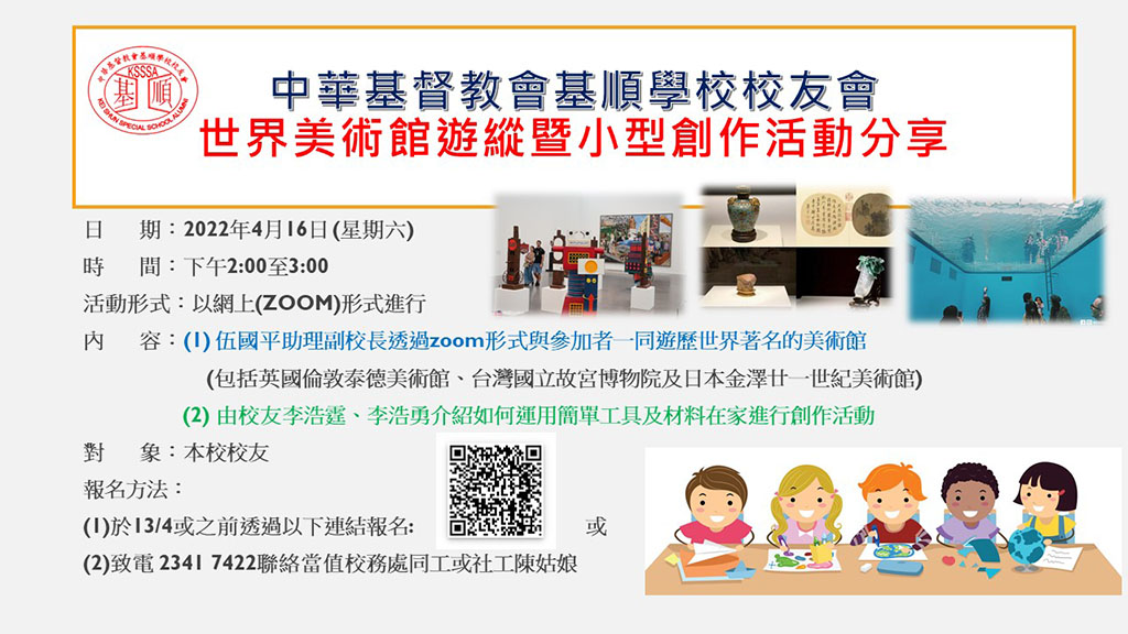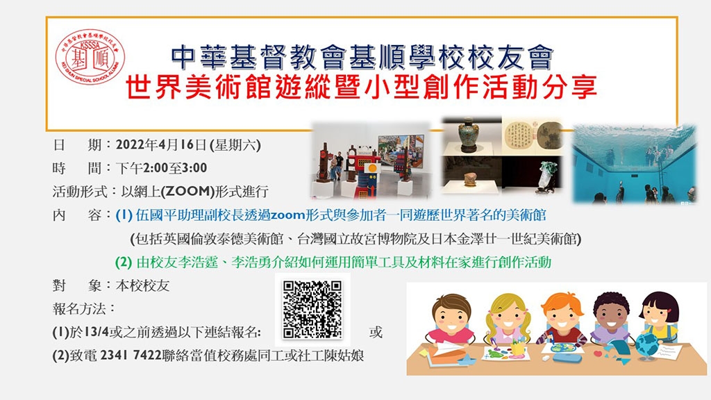 校友會將於4月16日(六)舉辦「世界美術館遊縱暨小型創作活動分享」,大家可以安在家中遊歷世界各大美術館,亦可進行簡單的創作活動