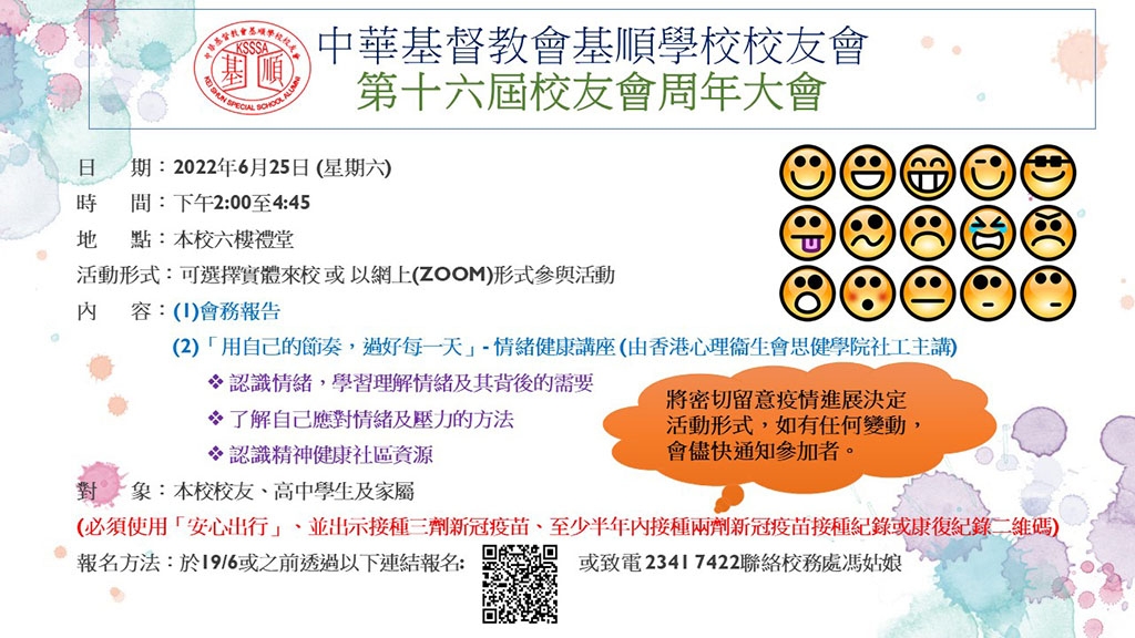 大家好! 一年一度的校友會周年大會將於6月25日(六)下午舉行,大家首次可以選擇實體來校